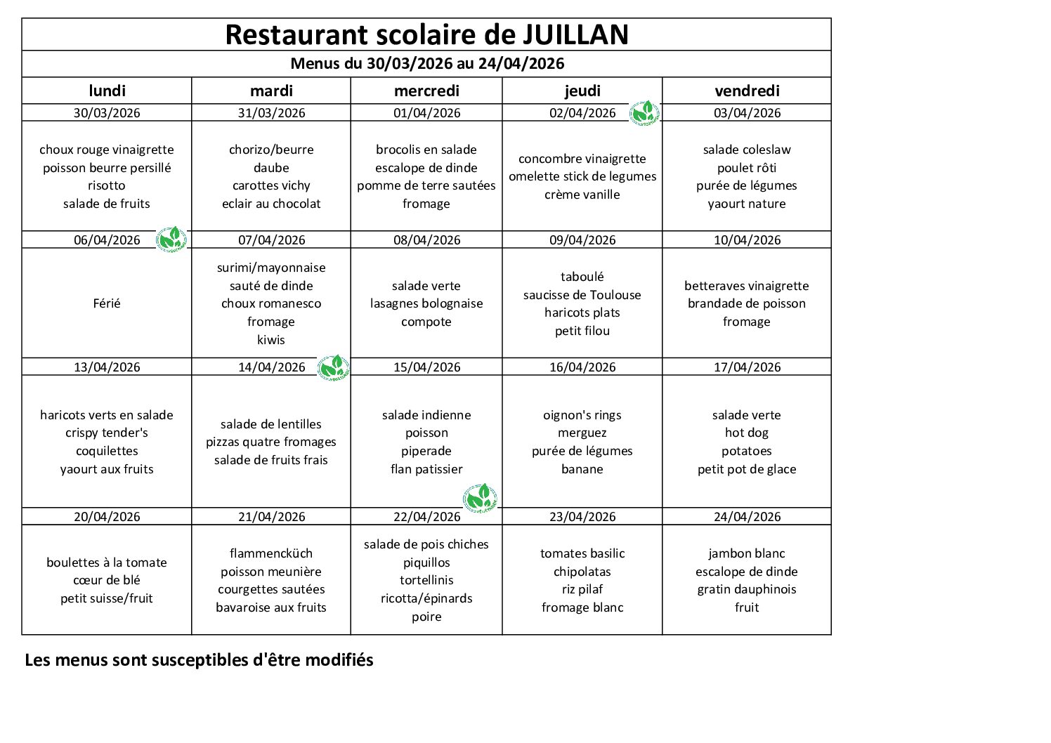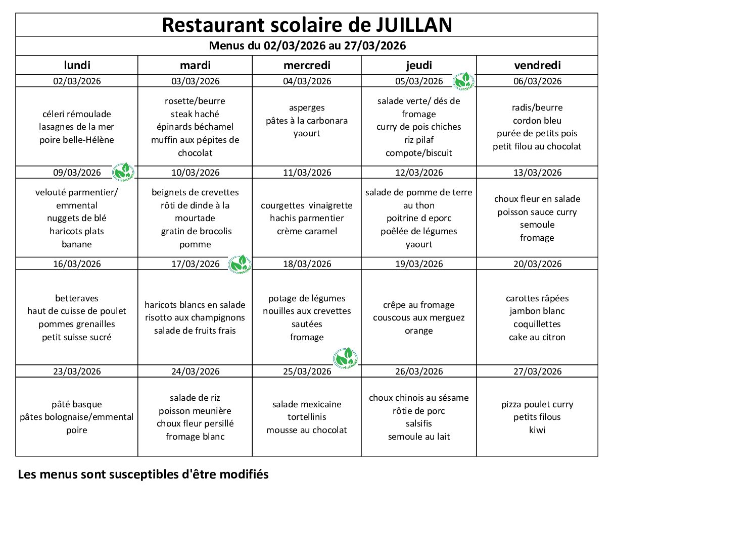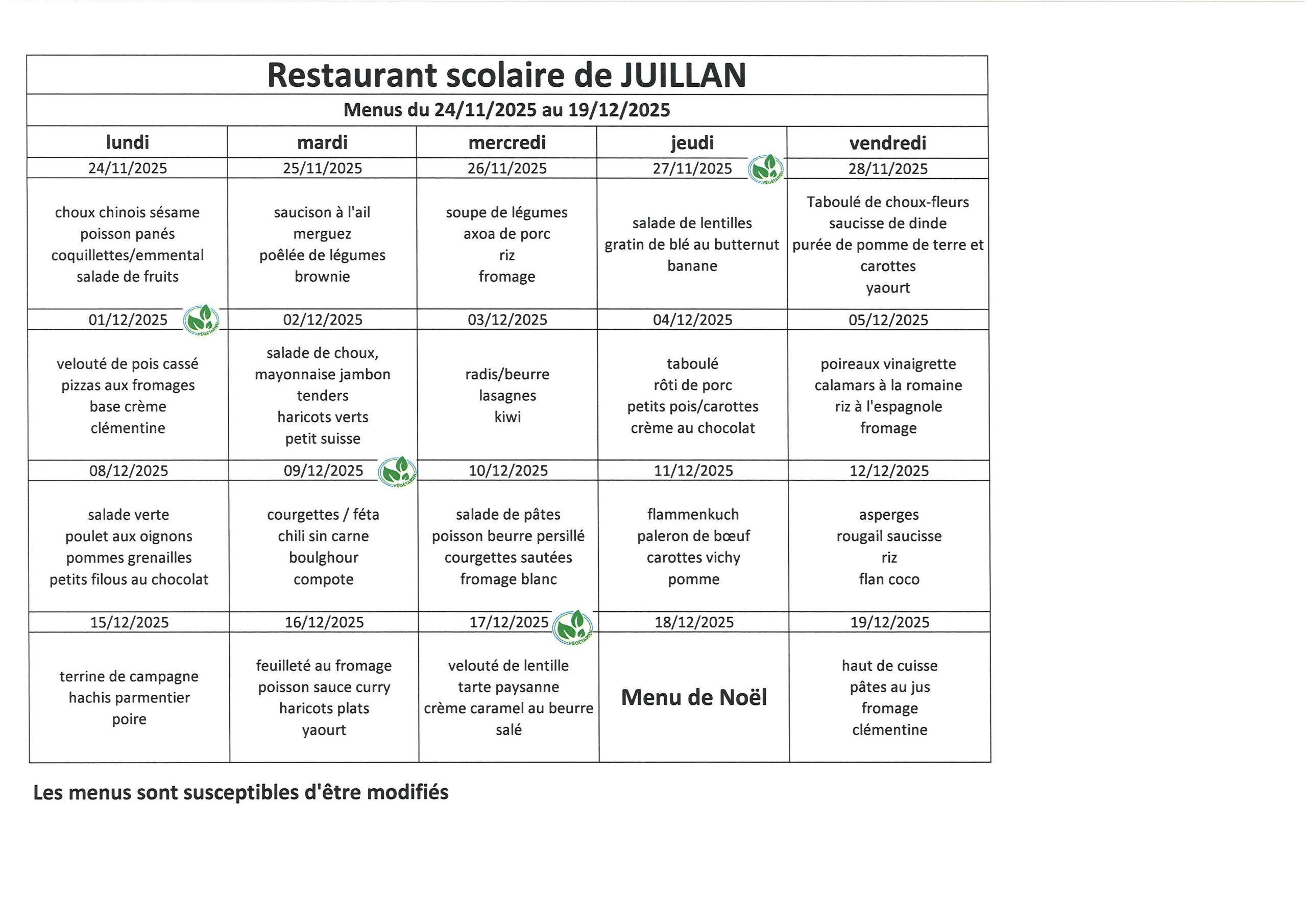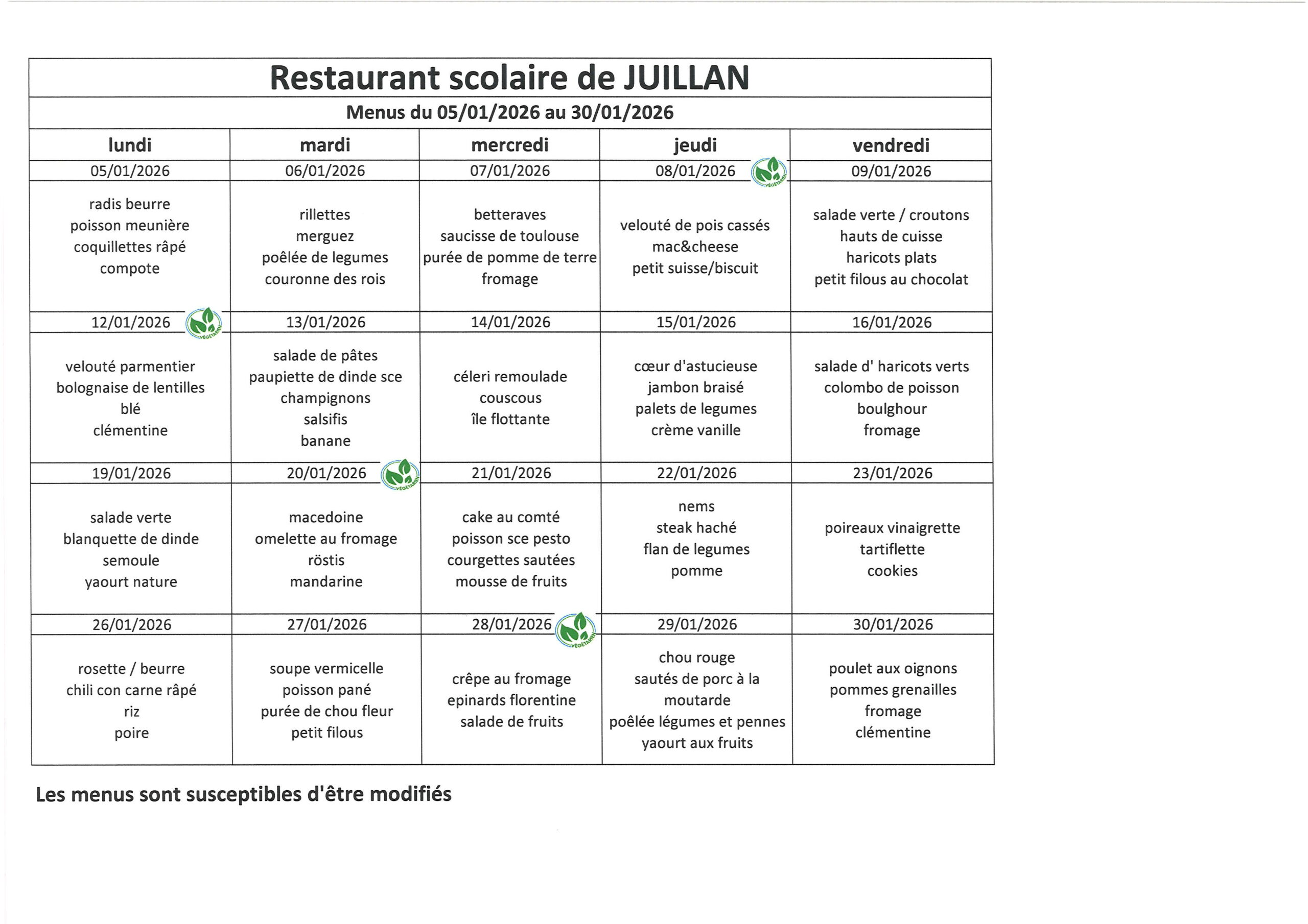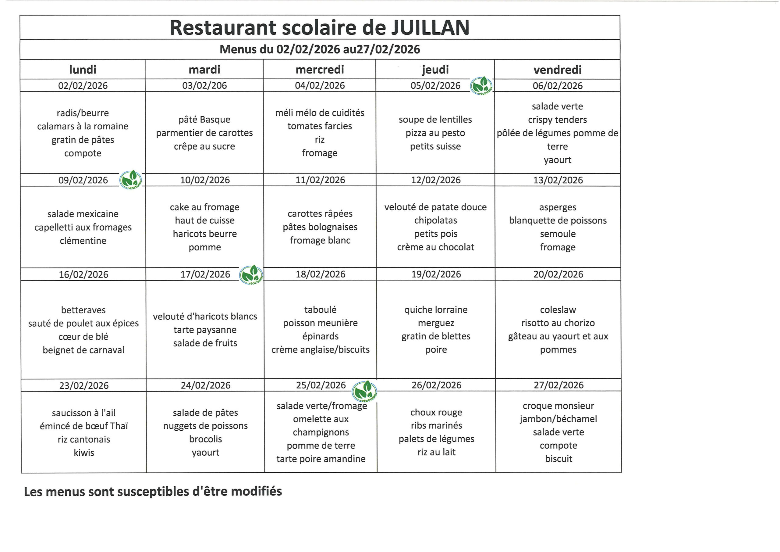 Accueil / Vie locale / Restaurant scolaire Coordonnées Coordonnées : restauration@juillan.fr Téléphone : 05 62 32 03 01 ou 06 16 30 52 75 Téléchargez les menus de la cantine